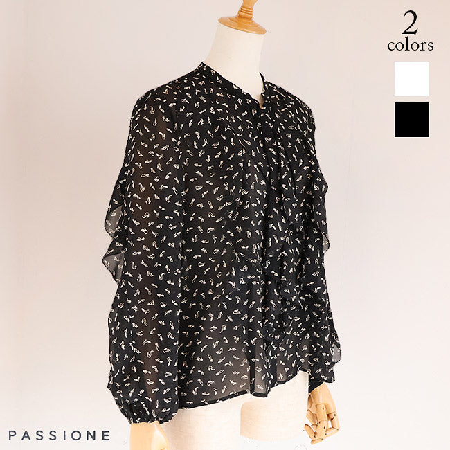 「PASSIONE(パシオーネ)」の大人気定番フリルブラウスが、今期は可愛いハイヒールプリントで登場しました。