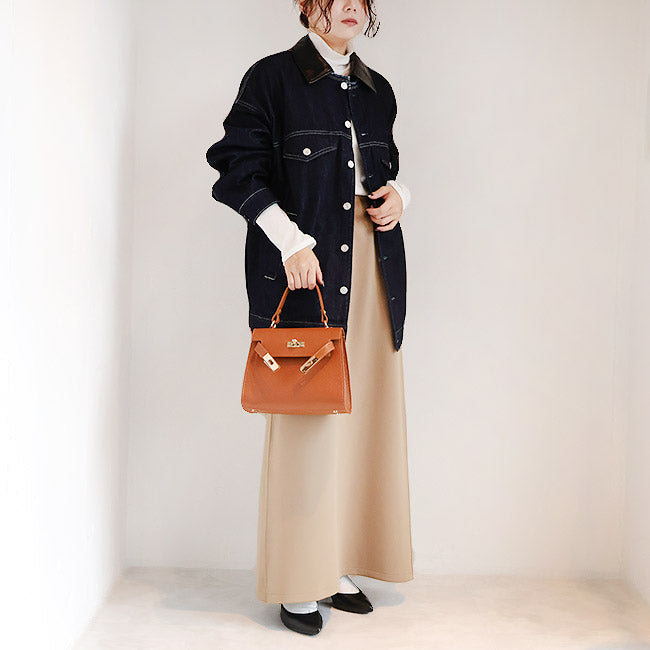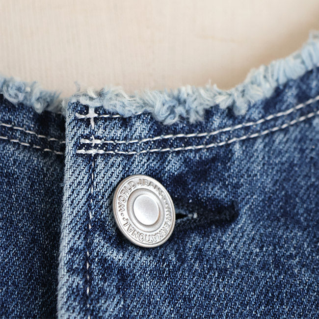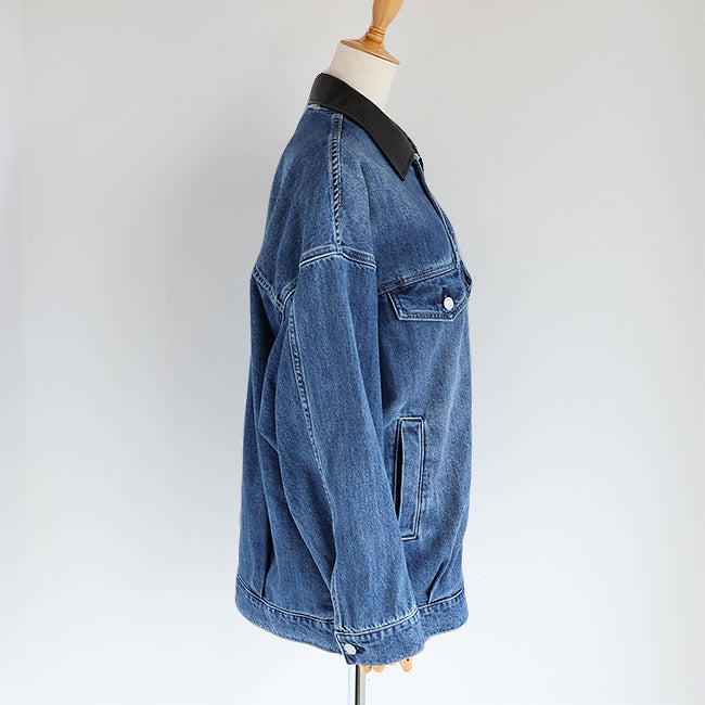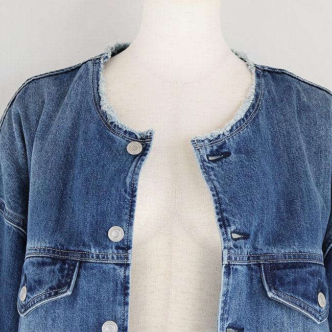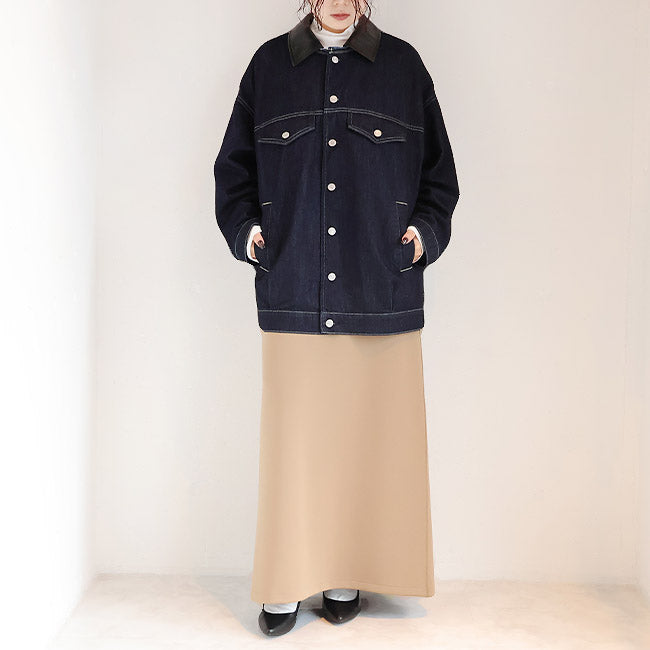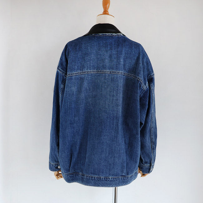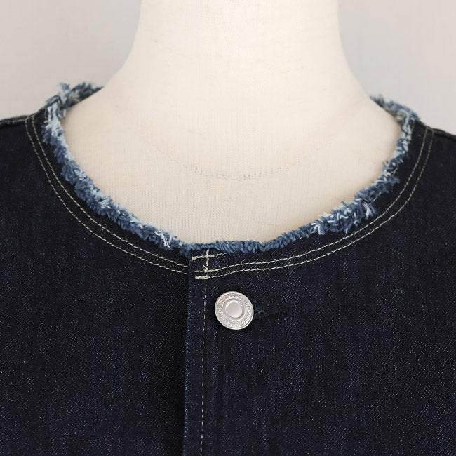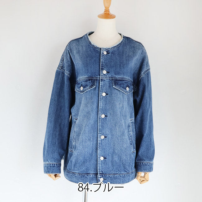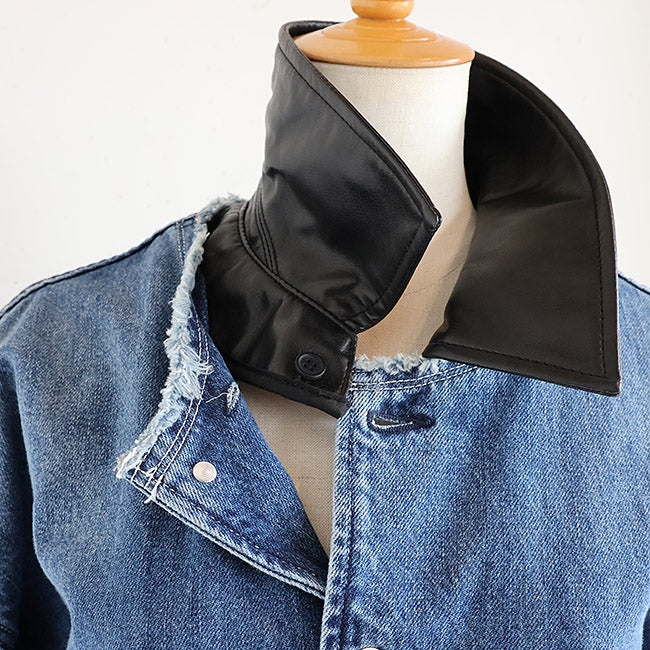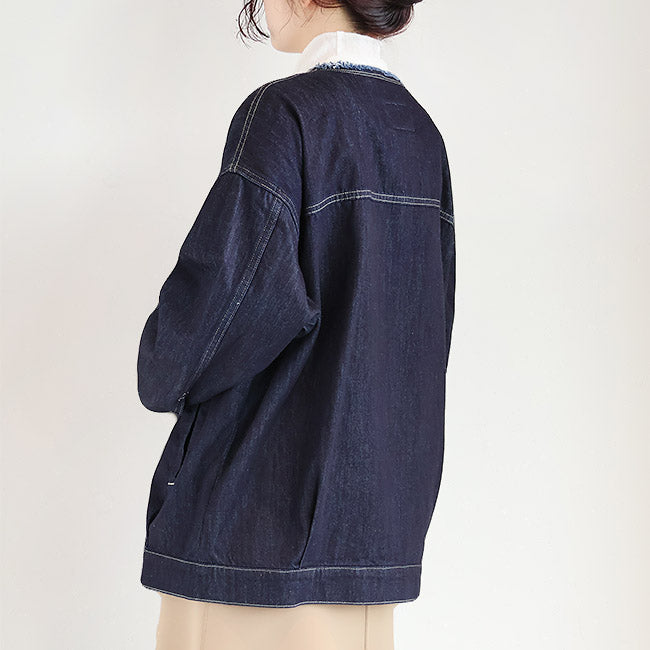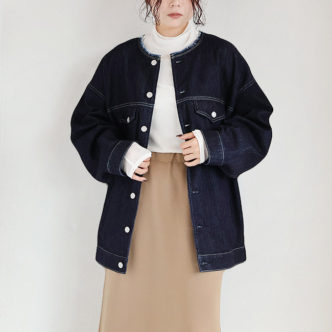 取り外し可能なレザー調の襟を外せば断ち切りカットオフのノーカラーにもなる2WAY仕様の新デザインデニムジャケットです。ゆったりワイドシルエットなのに落ち感のある柔らかいデニムで軽やかにカーディガン感覚で着用いただけます。肩の力を抜いた大人カジュアルスタイルにもちょっとモードに決めたい時にも雰囲気を変えたスタイリングが楽しめます。着用モデル 身長155cm