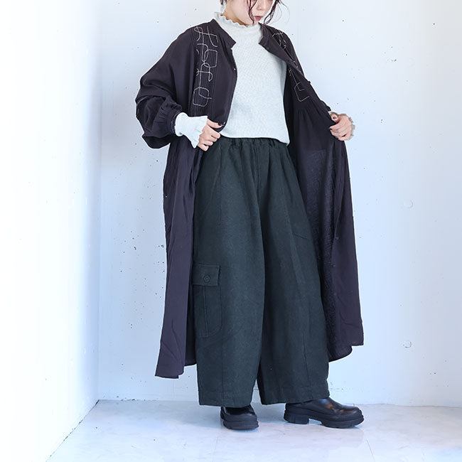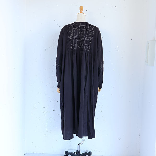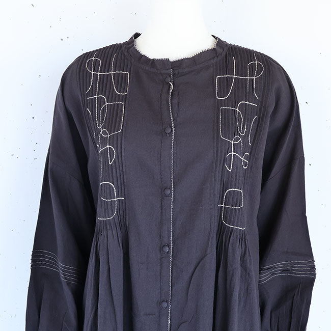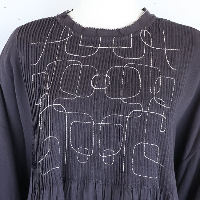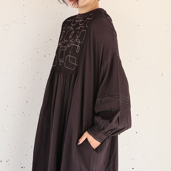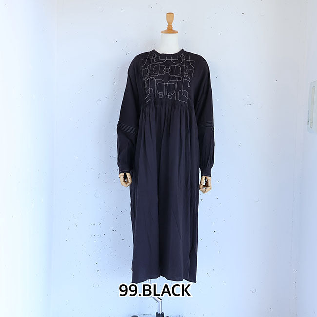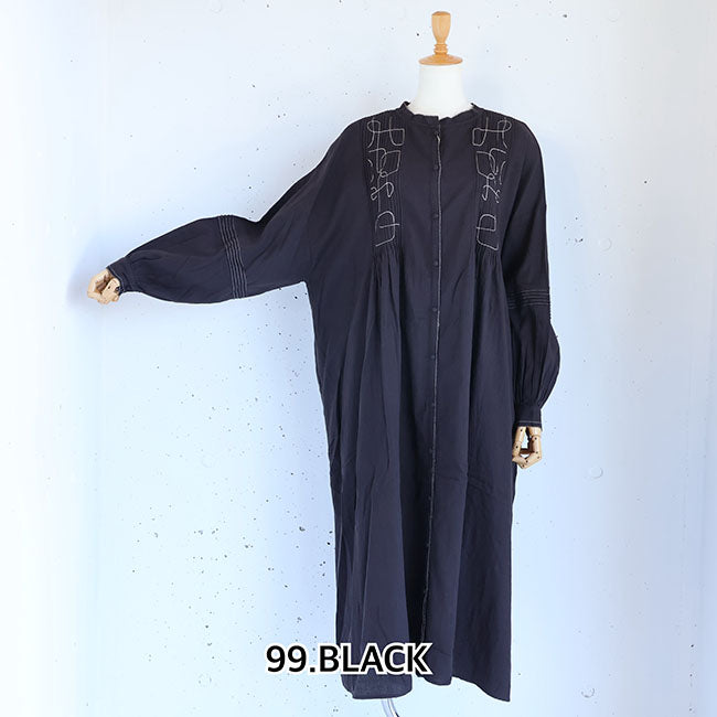 ふんわりソフトな肌あたりと細やかなシワ感を残したナチュラルな風合いが特徴のコットンモス生地で仕立てた、前後着用OKの2wayワンピース。幾何学模様の刺繍と細かいピンタックがシンプルながらも存在感を放ちます。空気をはら、ふんわり軽いひかえめな広がりのAラインシルエット。ピンタックやピコ刺繍とステッチ、ボタンはくるみボタンで細部までこだわった作り。ボタンは裾まで開くので羽織としても活躍なワンピースです。通気性もよく、季節の変わり目から冬にはタートルインなどの重ね着も◎季節もながく愛用いただけます。同素材シリーズー ブラウス「TB25309」着用モデル 身長155cm