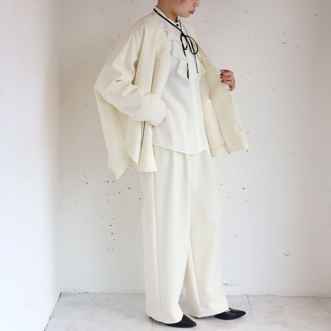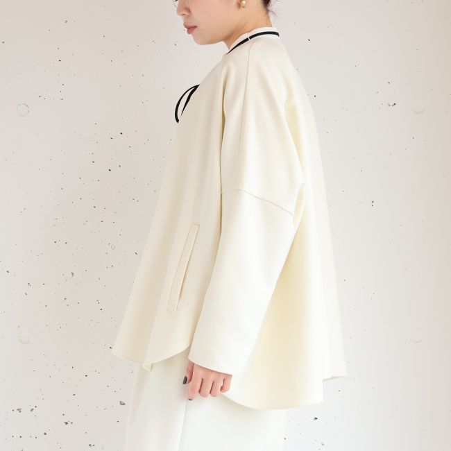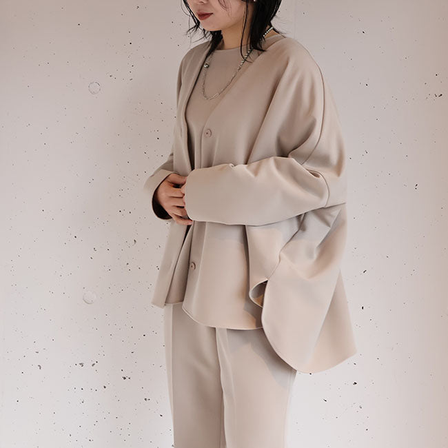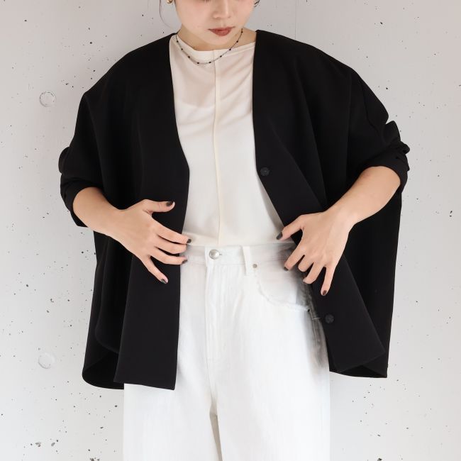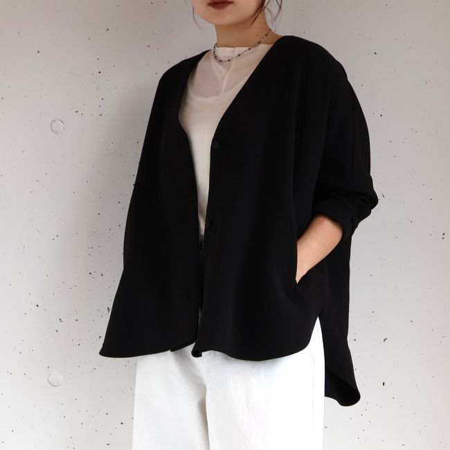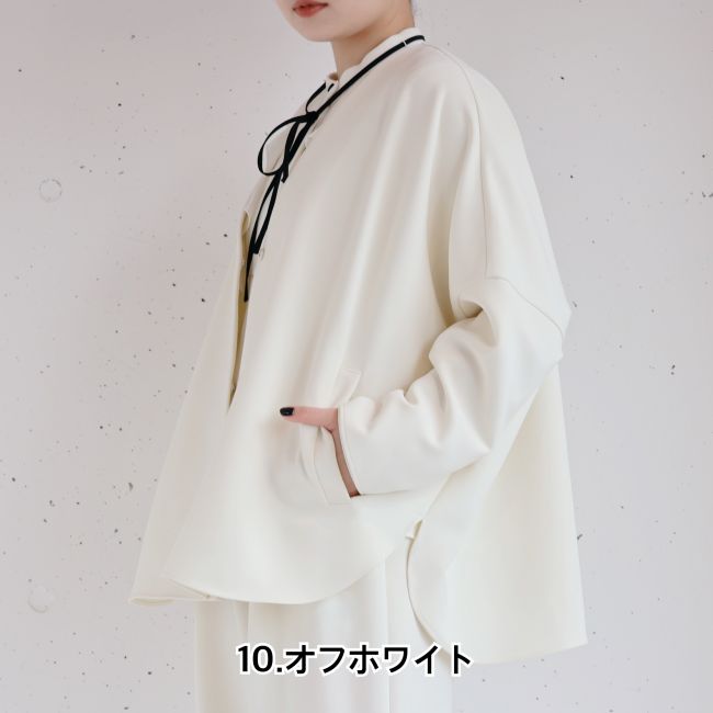 パシオーネ定番人気のセットアップシリーズが2026年再リリースで入荷♪新色にオフホワイトが登場しました!ジャケットなのにストレスフリー♪カーディガン感覚で気軽に羽織れてきちんと感も出してくれるVネックのカラージャケットが入荷しました。同素材シリーズ「パンツ」「ブラウス」とセットアップでの着用もオススメです。素材はストレッチ性もあり、生地の落ち感も美しいポリエステルストレッチ二重織りツイル生地を使用。シワも作らず、手洗いOKなのも嬉しいポイント。肩は楽に動きやすいドロップショルダー。全体的にゆったりとした立体的な技ありの美しいシルエット。サイドスリットを少し前位置にすることで、気になるヒップ回りもオシャレにカバーしてくれます。両サイドポケットあり。着用モデル 身長155cm